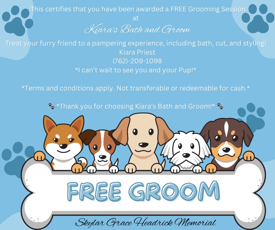 Gift Certificate for a complete grooming for one fur pup. I take my fur babies to Kiera and they love her. She is located in Cohutta GA. Winner will be drawn once all bids have been placed. Free local pick up on Monday or Tuesday only. Shipping 1.00